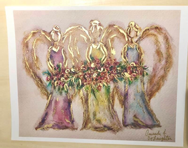 8x10 hand gilded watercolor angel trio