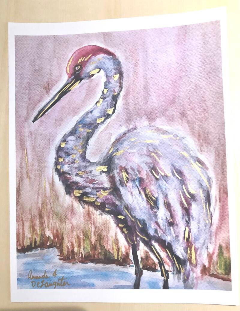 8x10 hand gilded watercolor sandhill crane