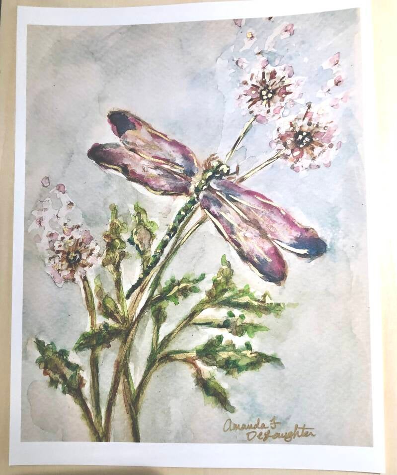 8x10 hand gilded watercolor dragonfly
