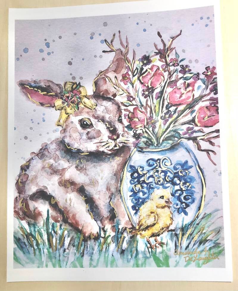 8x10 hand gilded watercolor bunny and chick