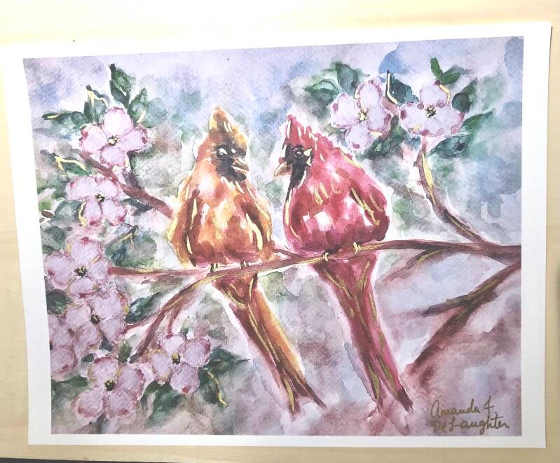 8x10 hand gilded watercolor dogwood birds