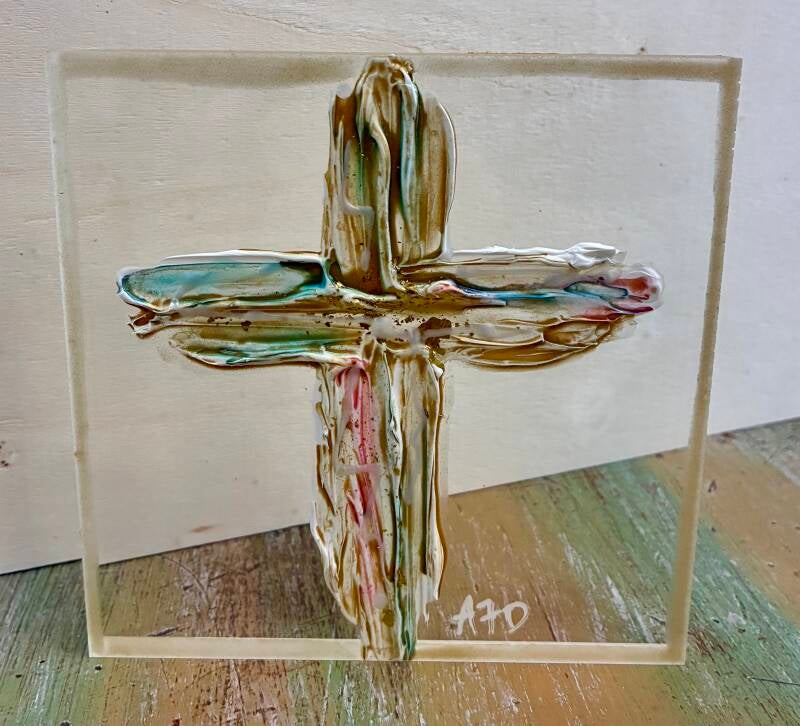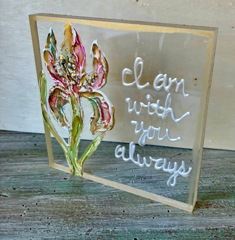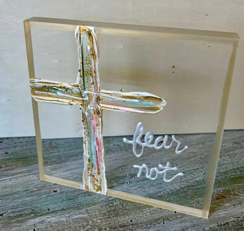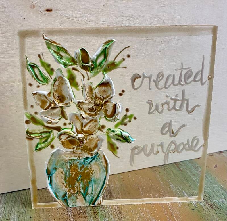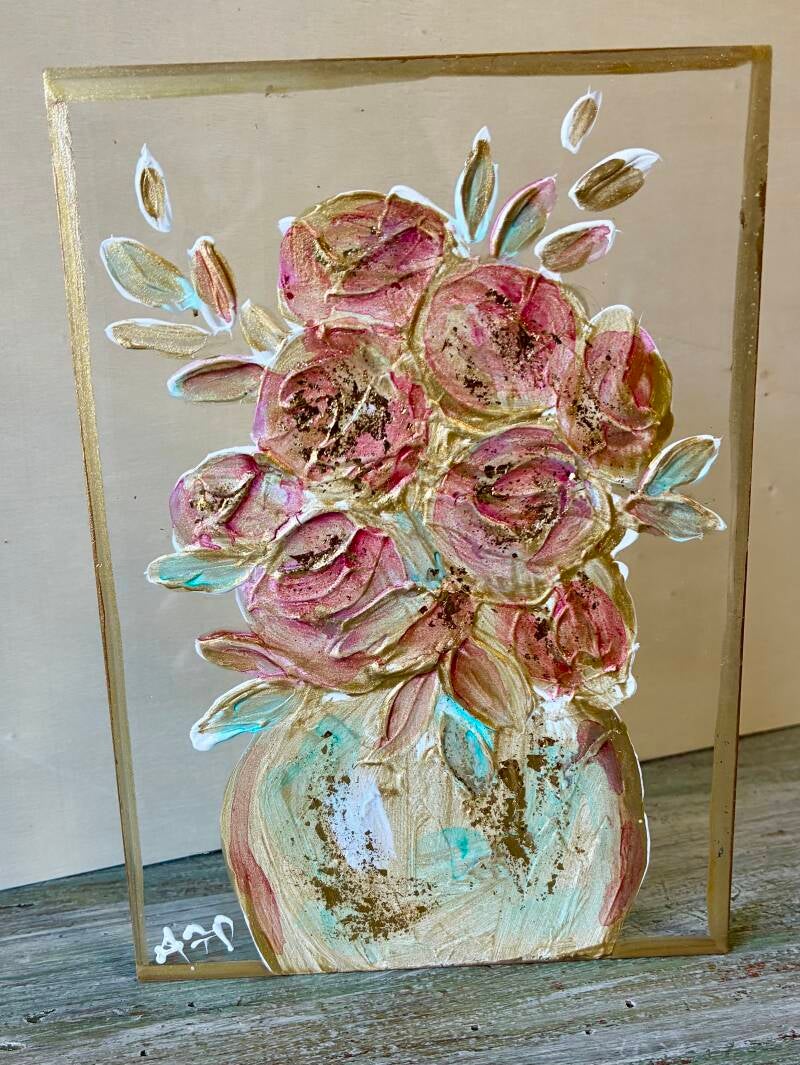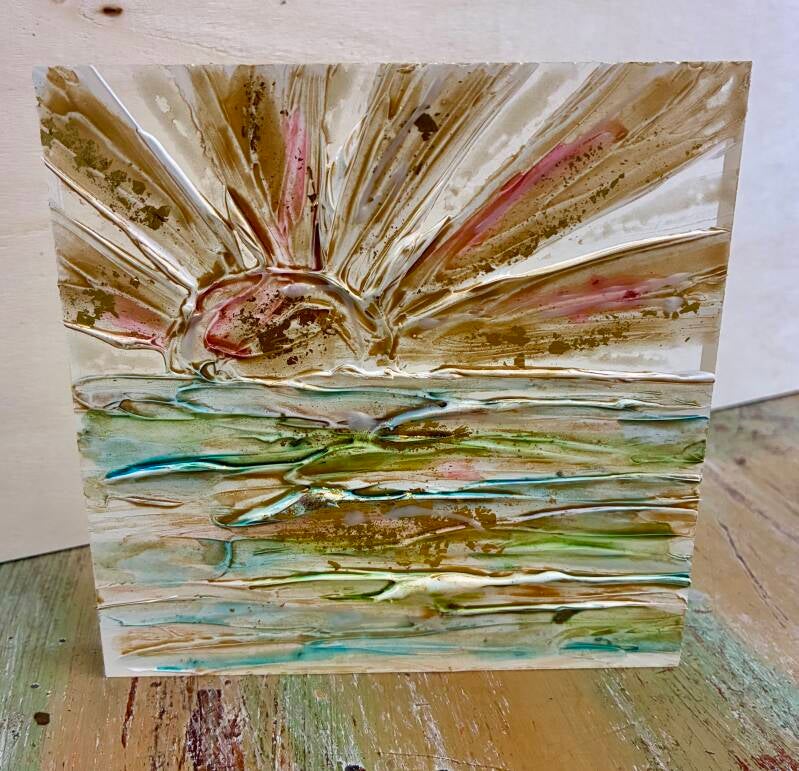 Each one of a kind art piece has texture with gold leaf on 5x5 or 5x7 clear acrylic block. Suggested retail price for each 5x5 is $33.50 and each 5x7 is $35.50.