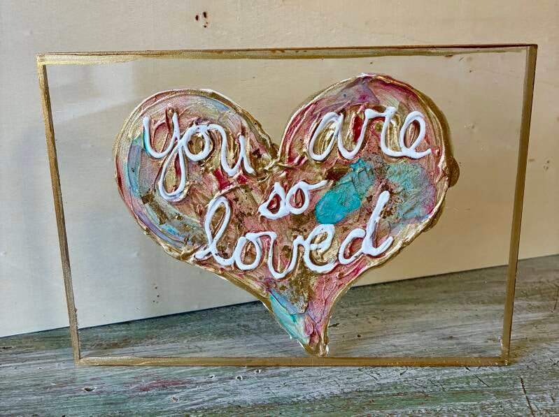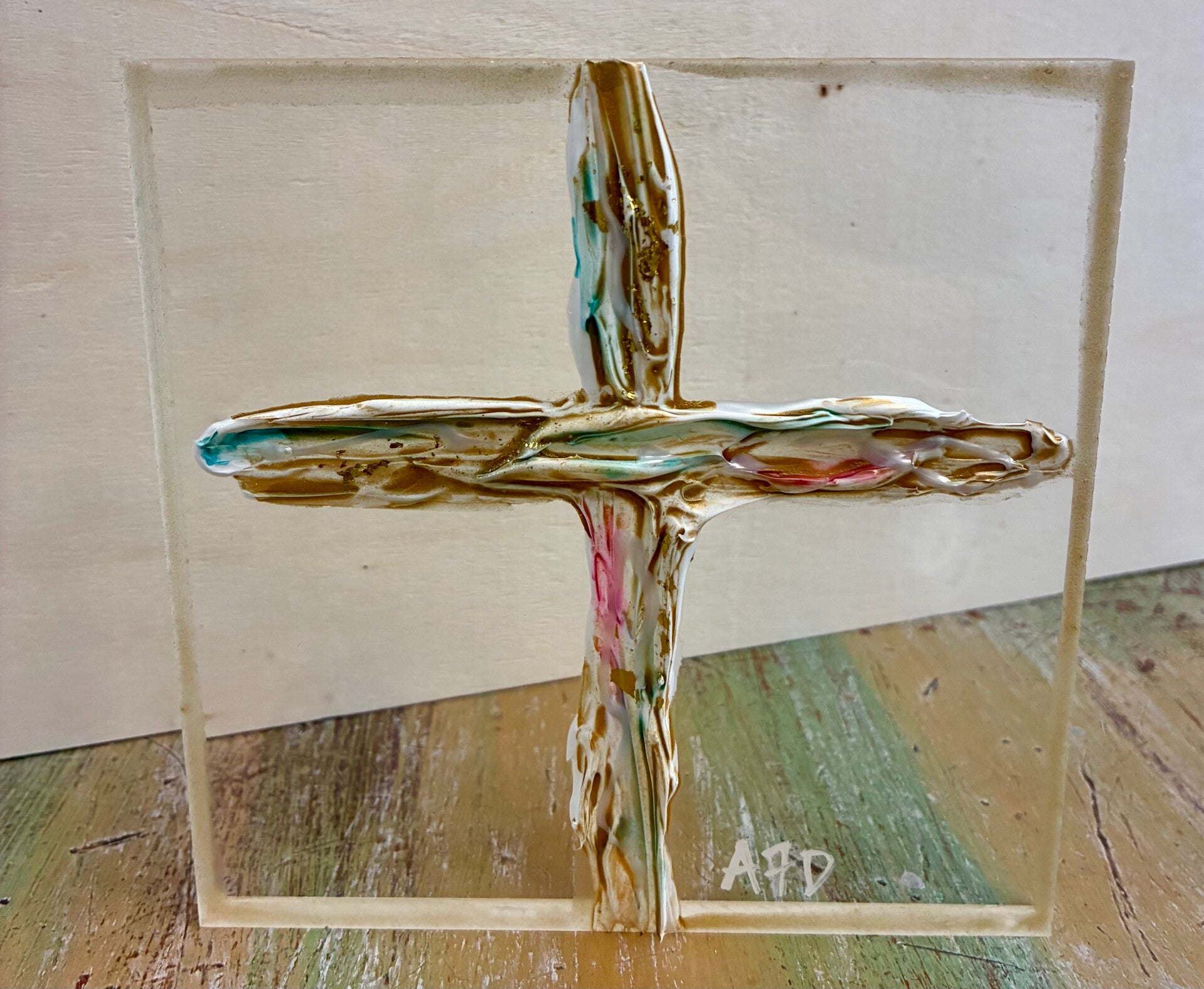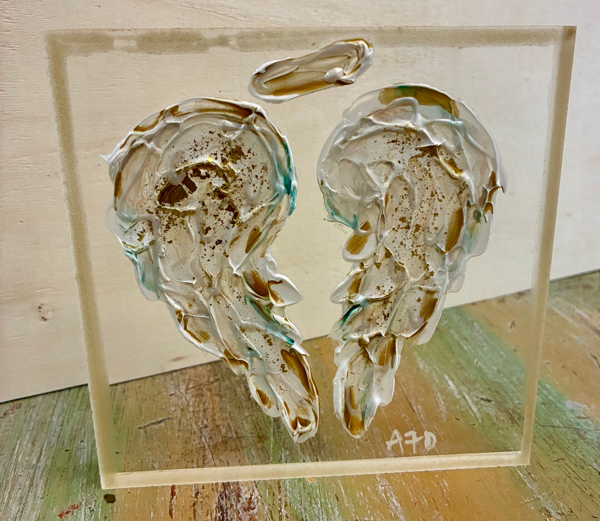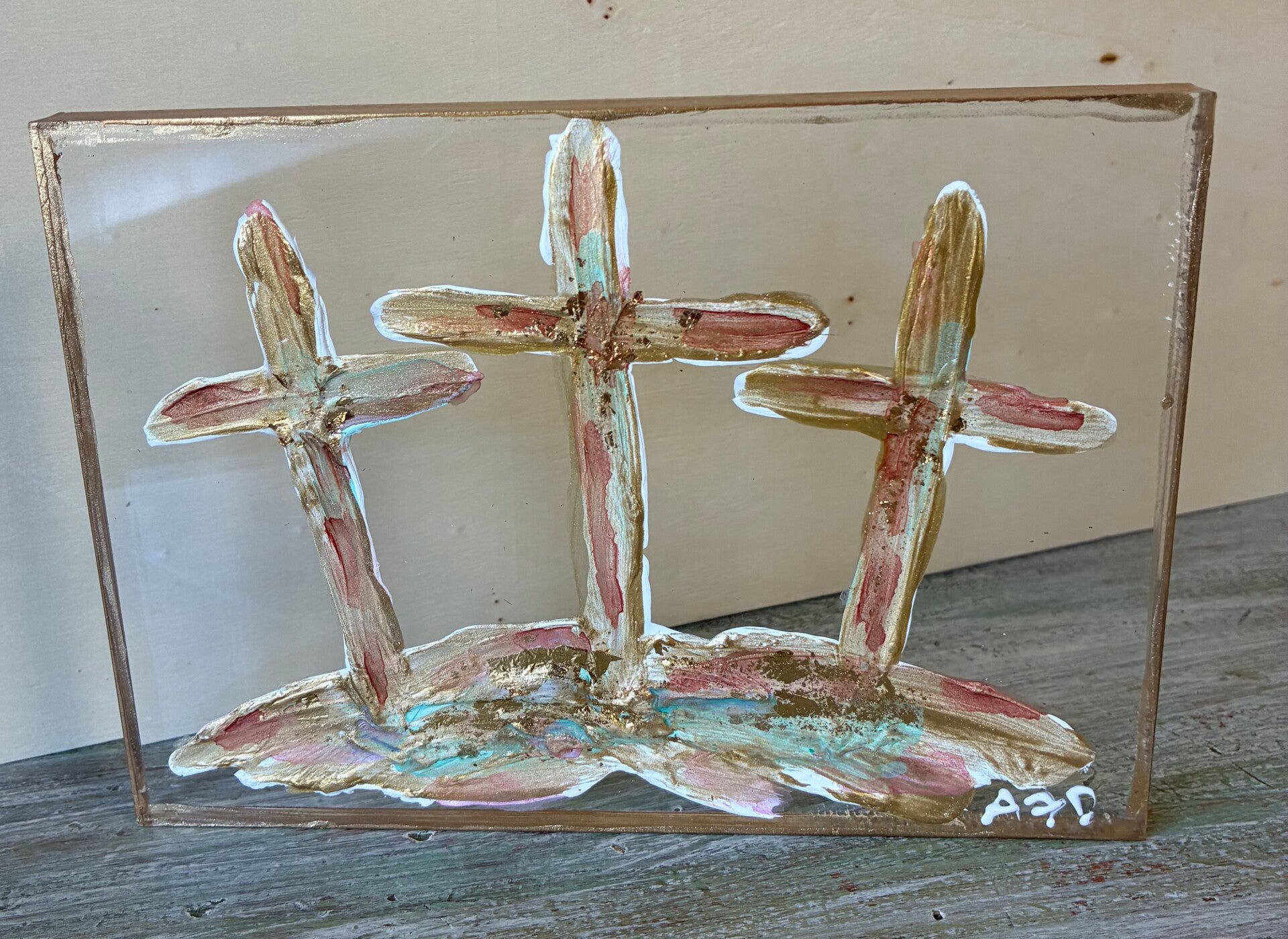 Each one of a kind art piece has texture with gold leaf on 5x5 or 5x7 clear acrylic block. Suggested retail price for each 5x5 is $33.50 and each 5x7 is $35.50.